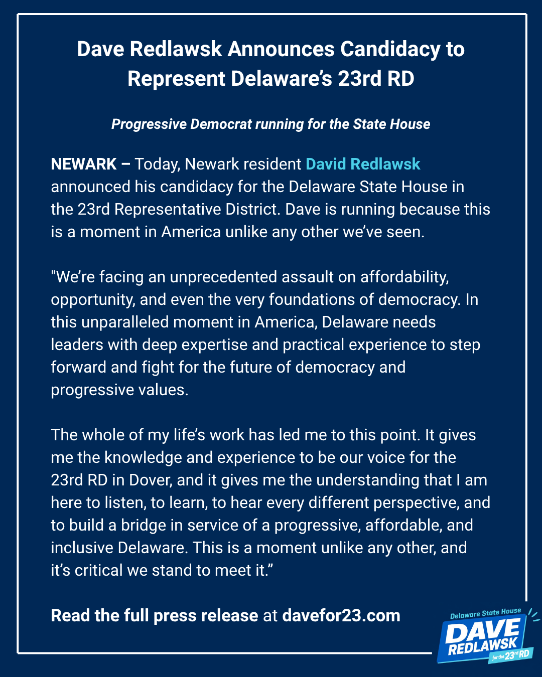 "We’re facing an unprecedented assault on affordability, opportunity, and even the very foundations of democracy. In this unparalleled moment in America, Delaware needs leaders with deep expertise and practical experience to step forward and fight for the future of democracy and progressive values.”